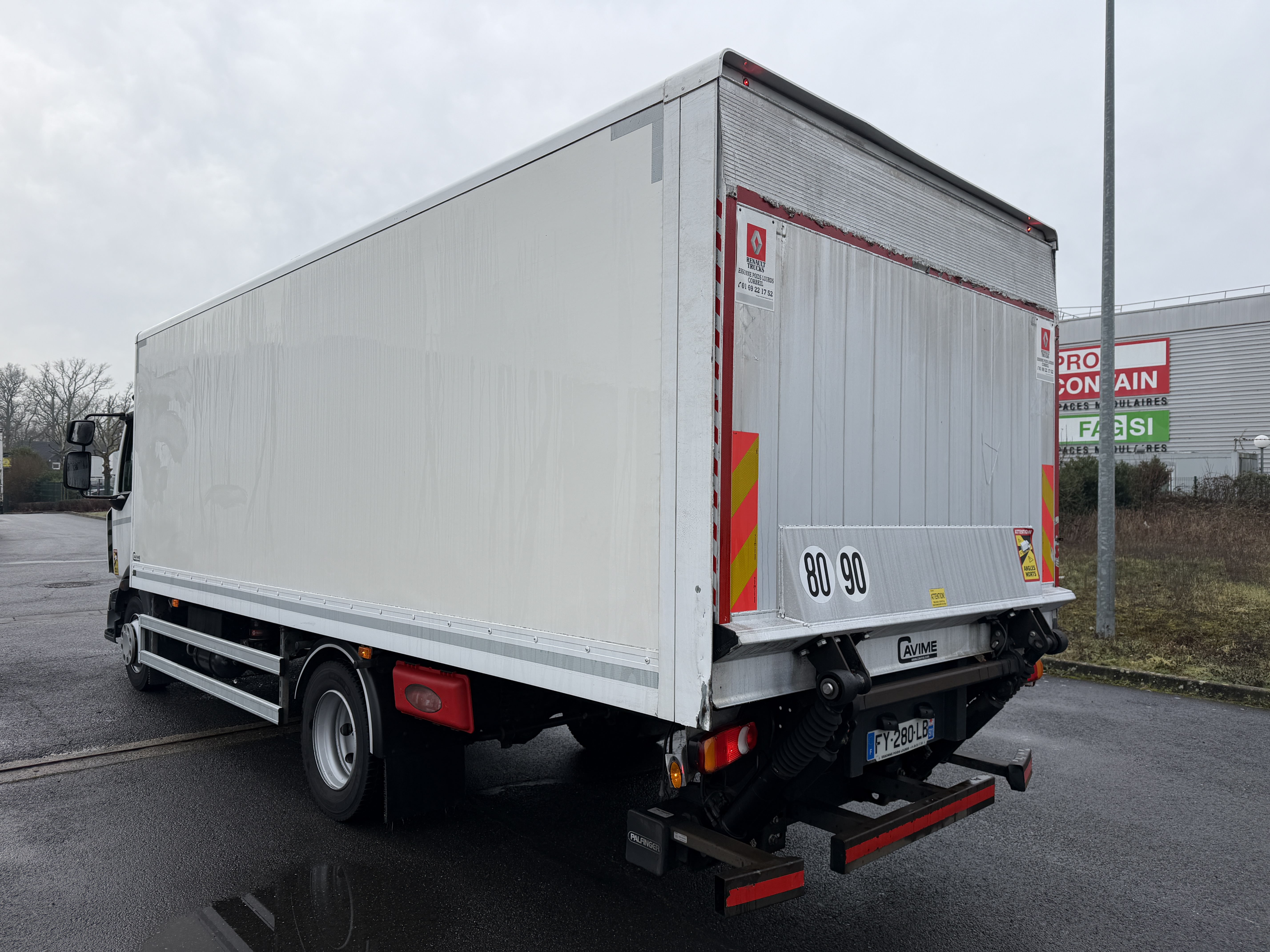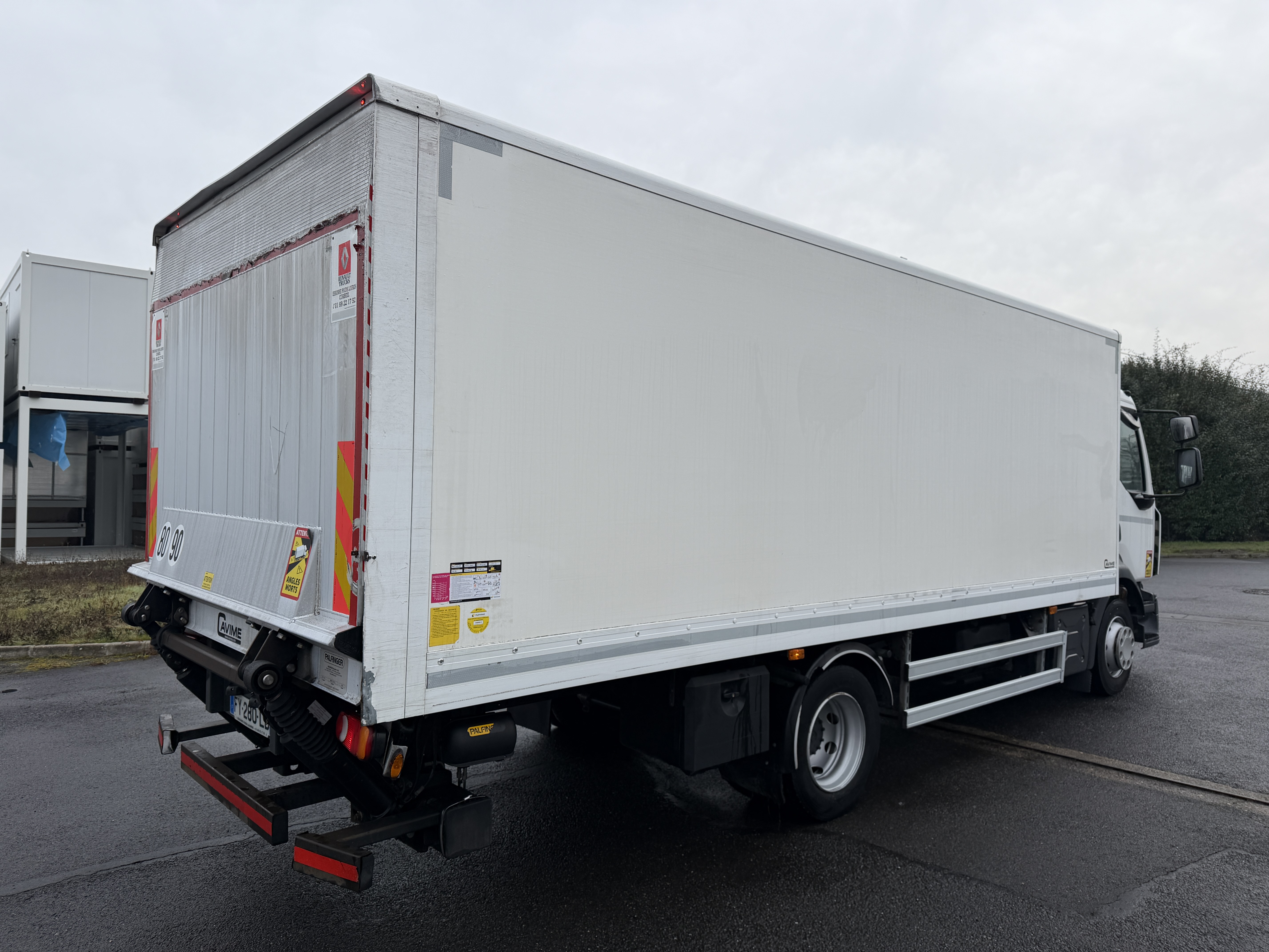 Cabine courte 3 places BV Auto Suspensions mecaniques Empattement:4m10 PTC:12t PV:6t55 Pneumatiques:245/70R19.5 Caisse Fourgon Long:6m30 Larg:2m49 Hauteur:1m85 Hayon Palfinger 2000kg\r\n