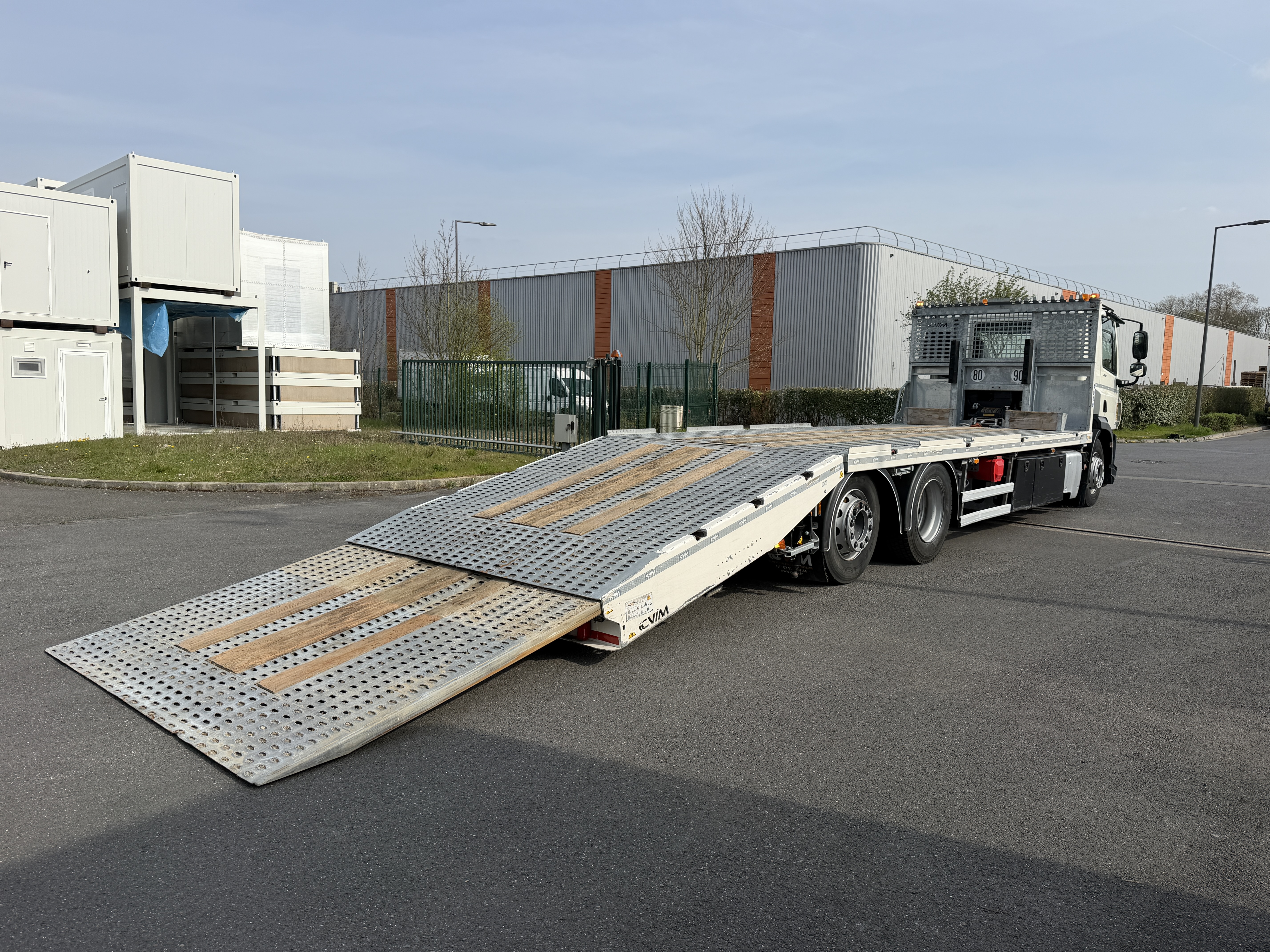 Cabine courte BV Auto Suspension air integrale PTC:26t PV:12t970 Pneumatiques:315/70R22.5 Plateau CVIM Long:9m Larg:2m53 Bequilles stabilisatrices Treuil Radiocommande